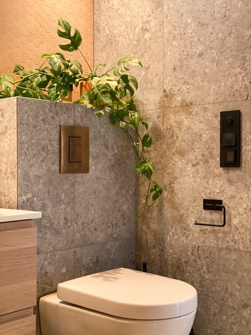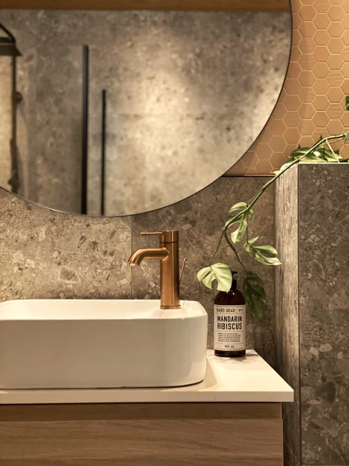 Familjen i Drammen ville ha ett badrum med varm atmosfär och som stack ut från badrum de sett tidigare. Med fria tyglar, extra fokus på detaljerna tog inredningsarkitekten på sig jobbet att designa ett unikt badrum.