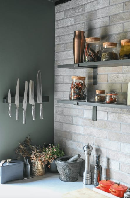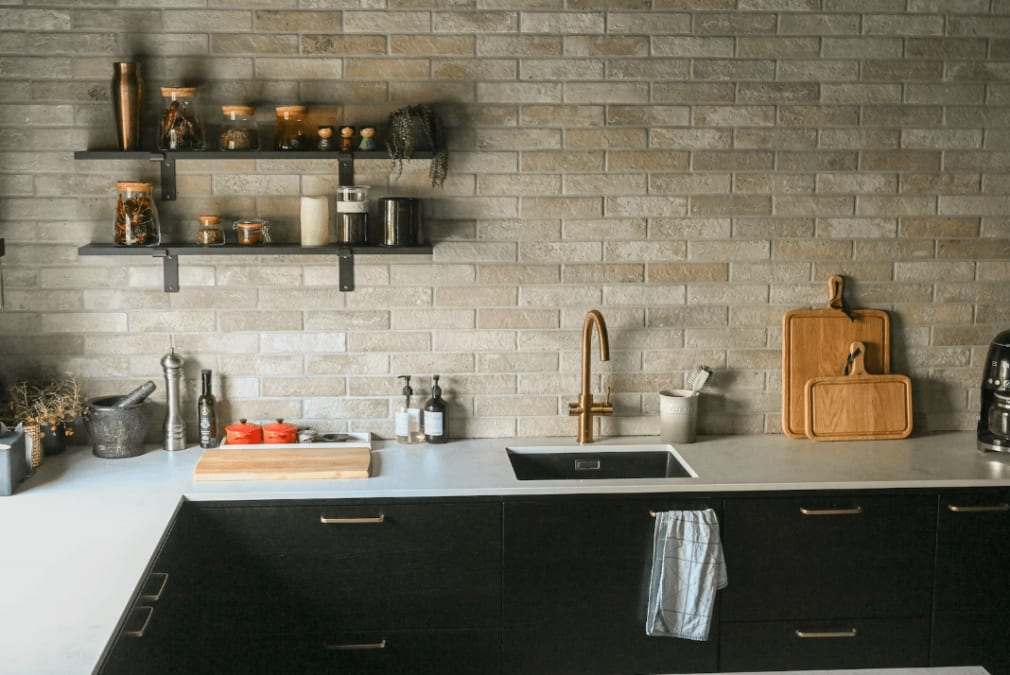 Med våra fasadsten och väggtegel plattor på plats har den "glada kocken" skapat ett kök som speglar hans personlighet och passion för matlagning.