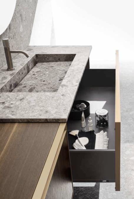 Underlimmat tvättställ är en variant många känner från köket. Denna har nu även nått badrummet. Fördelen här är att du får en bänkskiva och tvättställ, utan kant mellan för att fånga upp smuts. Vattenspill kan torkas direkt över diskbänken. Nackdelen är att det blir mindre utrymme i möbelns översta låda.