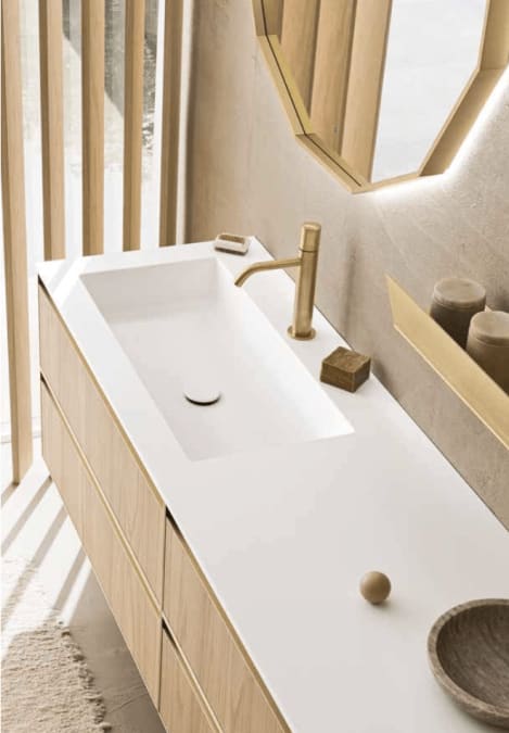Heltäckande bassäng: Ett heltäckande tvättställ täcker, som namnet antyder, hela ytan på en badrumsmöbel. Och gärna lite till. Kolla detta när du ska shoppa, bassängen ska vara lite bredare och lite djupare än själva möbeln för att undvika att vattenspill hamnar direkt på möbelns skrov. Traditionellt har sådana tvättställ gjorts av porslin. Fördelen med detta är att porslin är ett tätt material som inte drar till sig smuts, smuts och färg och därmed förblir attraktivt i flera år. Nackdelen är att maxbredden på ett sådant tvättställ är cirka 140cm. Det finns också olika kompositmaterial, här finns många namn, men en vanlig term är gjutmarmor. Denna består av olika material såsom krossad sten och harts. Den stora fördelen är att dessa produkter lättare kan formas för att skapa moderna former och stora bredder.