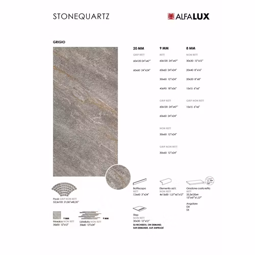 Granitkeramik Stonequartz är väl lämpad för badrumsgolv och finns i 3 olika färger. Klinkern har ett klassiskt format och med stenkänsla. Ytan är matt och lätt strukturerad. Finns även i 15x15, 30x30 och mosaik 5x5.