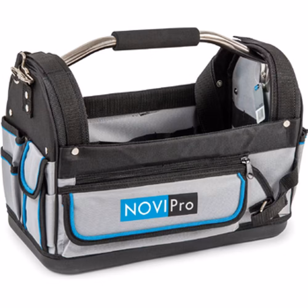 Slitstark verktygsväska i polyester med vattenavvisande PE-botten. Praktisk sidoficka på framsidan med lock och öppna sidofickor på baksidan. Med axelrem och ett handtag som är gummiförsett i mitten.