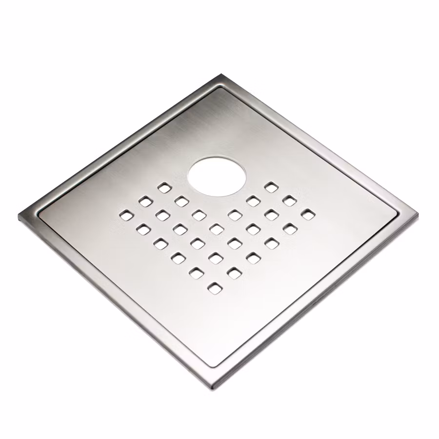 Elegant golvbrunnssil med urtag av borstat rostfritt stål typ AISI 316. Godstjocklek ram: 0,8 mm. Godstjocklek sil: 2 mm. Syrafast. Rekommenderad i miljöer med högre krav där t.ex. klorider och salt förekommer.