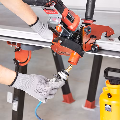 Fästet för vinkelslip ger hög stabilitet och precision vid raka och vinklade snitt (45°–90°). Justerbart kapdjup, möjlighet till öppningar/utskärningar och stöd via fyra stödhjul och extra hjul för styrskena. Passar de flesta vinkelslipar och kan användas för både torr- och våtkapning. Max kapdjup: 20 mm vid 90° och 16 mm vid 45°. Levereras med Ø125 mm turboklinga och anslutning för dammutsug – robust konstruktion minimerar vibrationer för exakt arbete.